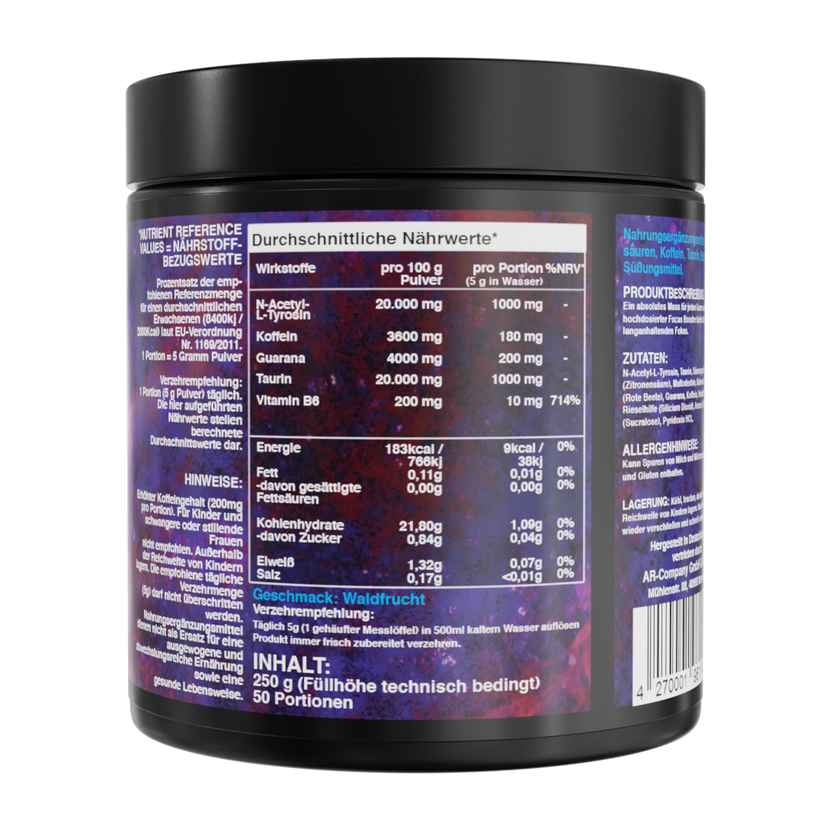 Zutaten: N-Acetyl-L-Tyrosin, Taurin, Säurungsmittel (Zitronensäure), Maltodextrin, färbendes Lebensmittel (Rote Beete), Guarana, Koffein, Farbstoff (Beta Carotine), Rieselhilfe (Silicium Dioxid), Aroma, Süßungsmittel (Sucralose), Pyridoxin HCL.