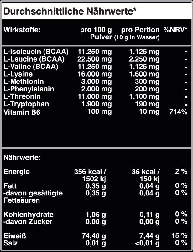 Zutaten: Essentielle Aminosäurenmischung (L-Leucin, L-Lysin HCL, L-Valin, L-Isoleucin, L-Threonin, L-Methionin, L-Phenylalanin, L-Tryptophan), N-Acetyl-L-Tyrosin, Säuerungsmittel (Zitronensäure), Taurin, Guarana, Koffein, Inulin, Aroma, Farbstoff (Beta Carotin, Indigotin), Pyridoxin HCL, Süßungsmittel (Sucralose), Emulgator (Sonnenblumenlecithin).